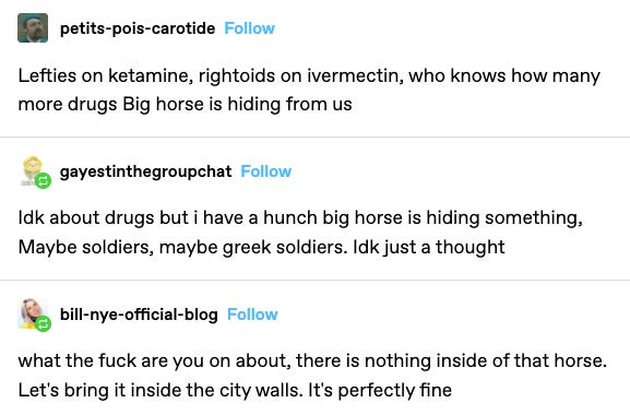 Stuff I saw on the internet last week: "Who knows how many more drugs Big Horse is hiding from us?"